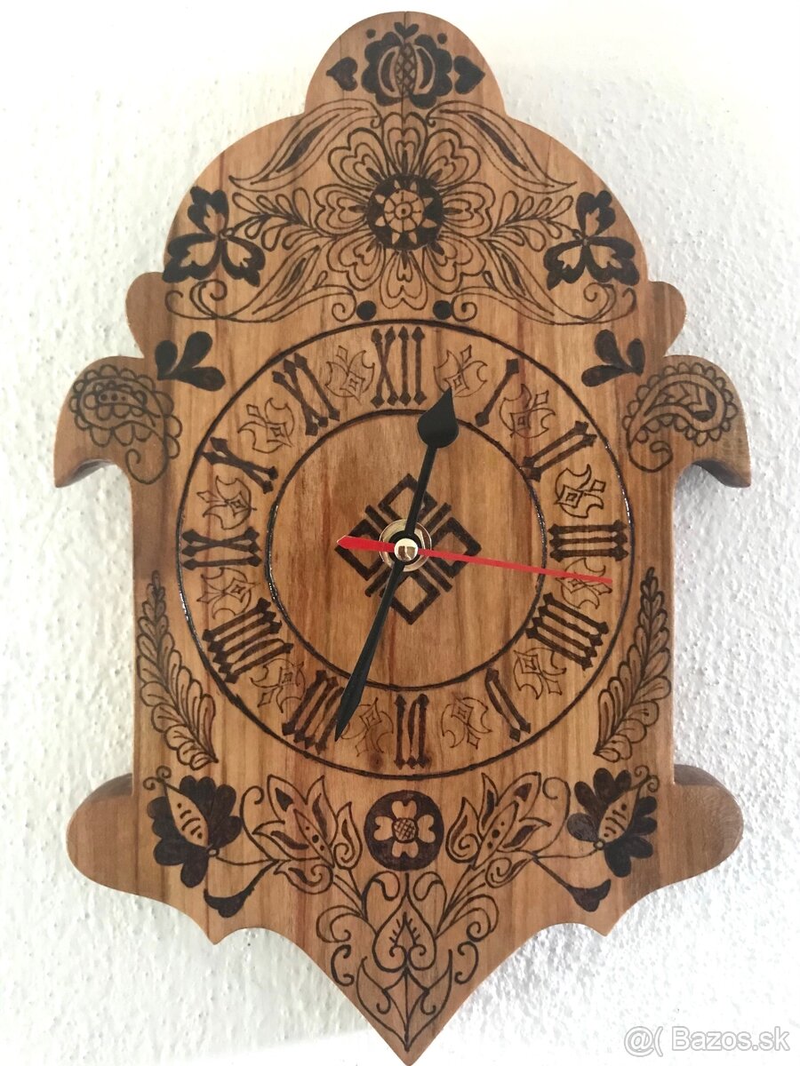 Predám nástenné hodiny z čerešňového dreva vyrobené vyrezávaním a zdobené technikou pyrografia. Ošetrené prírodným olejom a bezfarebným lakom. Jedná sa o originál. Nikdy nevyrábam rovnaké kusy. Osadené kvalitným tichým Quartz strojčekom. Ideálne ako vianočný darček, na chalupu… Výška 27,5cm x šírka 18cm x hrúbka 2cm. Kontaktovať mailom.