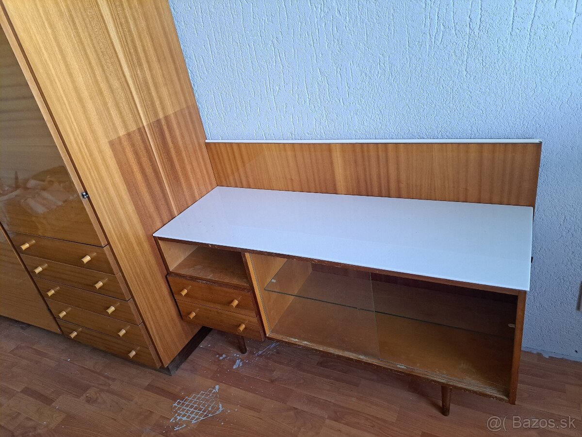 Predám za simbolickú cenu retro spálnovú zostavu zo 70tich rokov od popredného nábytkového návrhára Mojmíra Požára...poctivé drevo,preglejka dýha,lak...sú to zbytky zo spálnovej zostavy,nabytok vcelku zachovalý,ale chýbajú klúče ku skriniam...inak ok vsetko spolu za 50€...po dohode viem dovoz zabezpeciť dodávkou....Dovoz viem zabezpecit dodavkou