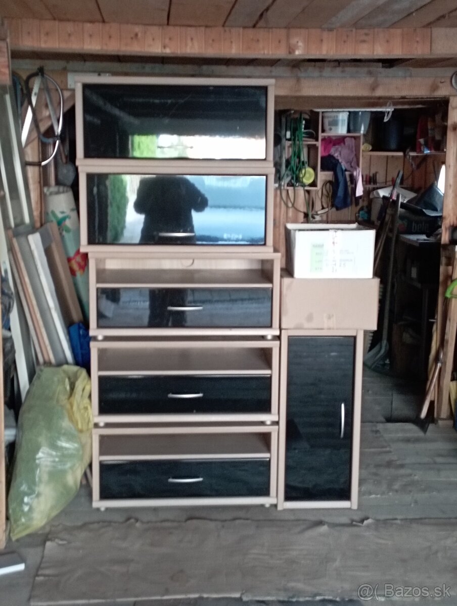 Predám nábytok do obývačky 3 diely na stenu a 3 diely pod tv polička a šuflík za 1 diel 15€ spolu 90€ už je v demonte v garáži