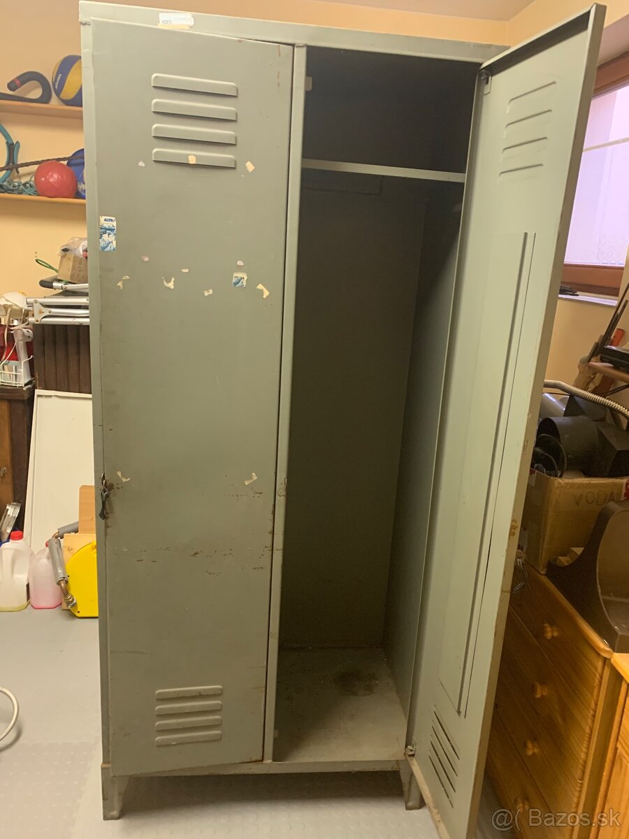 Plechová skriňa - [14.2. 2026]Dvojdielna šatníková plechová skriňa so šírkou 83 cm, hĺbkou 56 cm a výškou 1,86 m s možnosťou uzamknutia visiacim zámkom.
