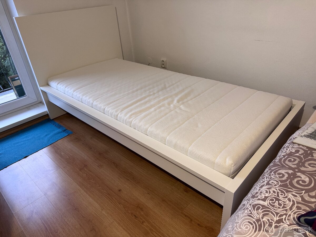 Ponúkam na predaj jednolôžkovú posteľ rozmer 90x200. Kupovaná v IKEA. Predajná cena pôvodná bola Rám 139€, Matrac 90€, Rošt 25€ čo spolu činí 254€. Posteľ využívana mesiac. Dôvod predaja je že je nevyužívana z dôvodu sťahovania. Plus k matracu viem poskytnúť dve plachty úplne zdarma.