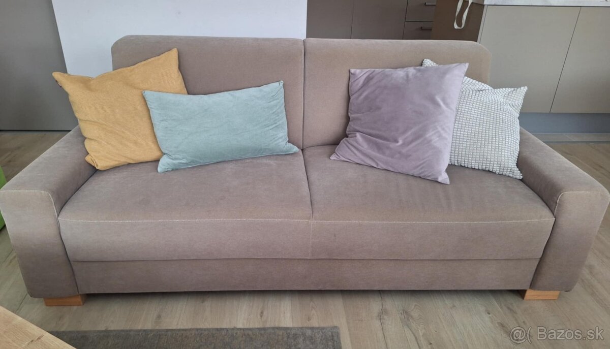 Predám sedačku šírka 190cm, hĺbka 92, výška 80cm, kávovej farby, s drevenými nôžkami. Poťah je odolný voči škvrnám a oderu, ľahko sa čistí. Nie je rozkladacia. Vo výbornom stave. Osobný odber KE.