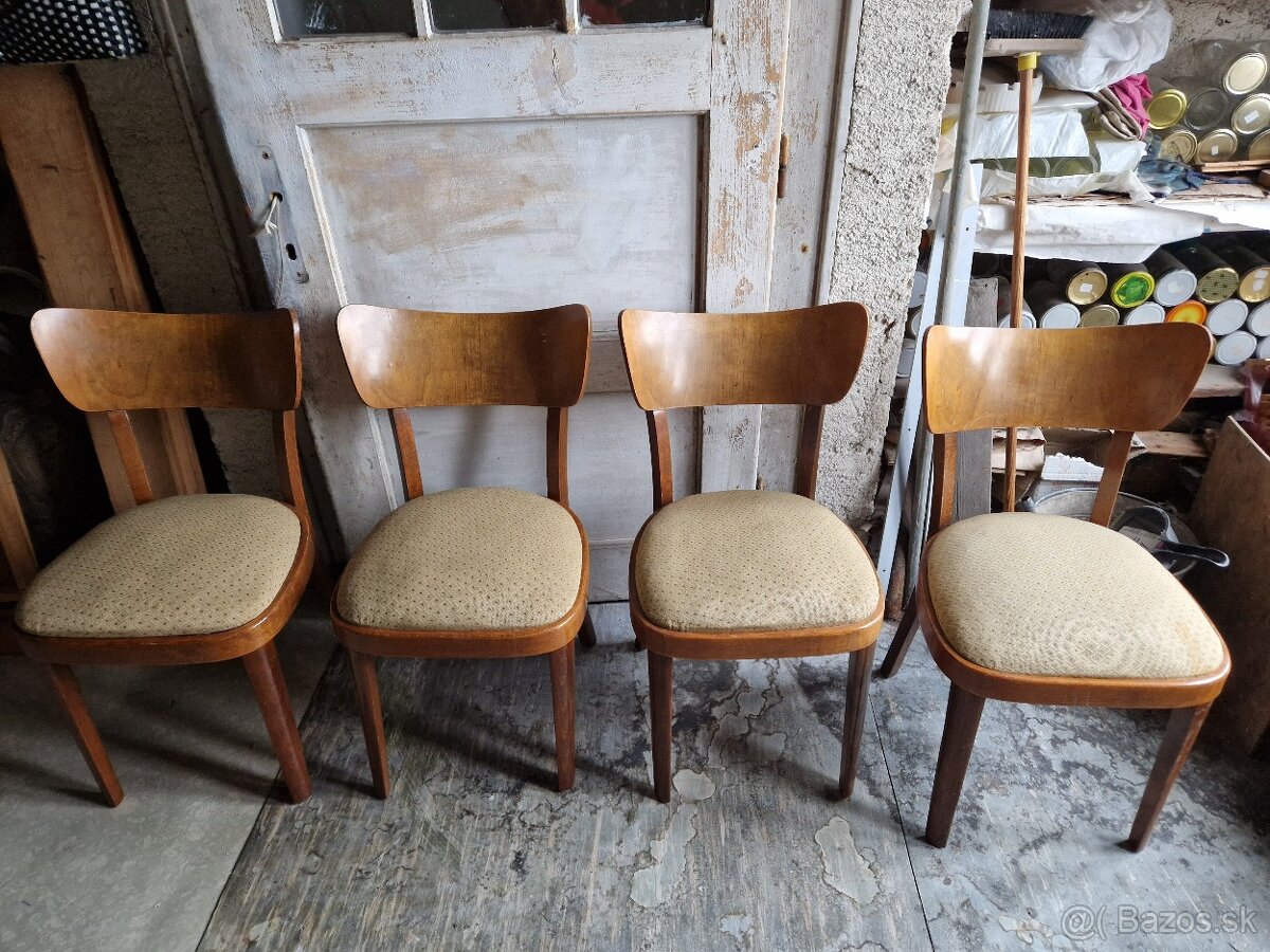 Retro drevene stolicky. Pruzinovy podsedak. 4 kusy. Nalezovy, povodny stav. Cena za kus 25eur. Iba osobny odber v RK