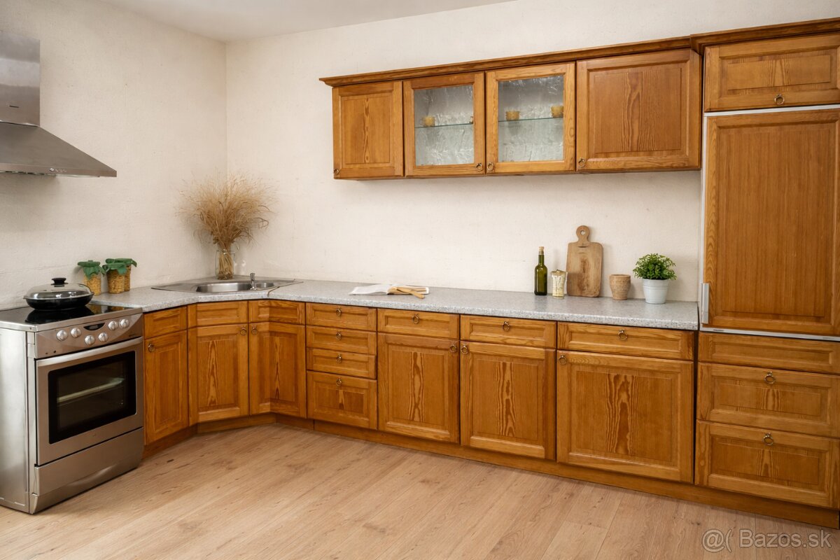 Predám peknú kuchyňu. Teplý tón dreva. Praktická dispozícia vrátane rohového drezu. Súčasťou rúra, sklokeramická doska, chladnička a kovový komínový digestor.