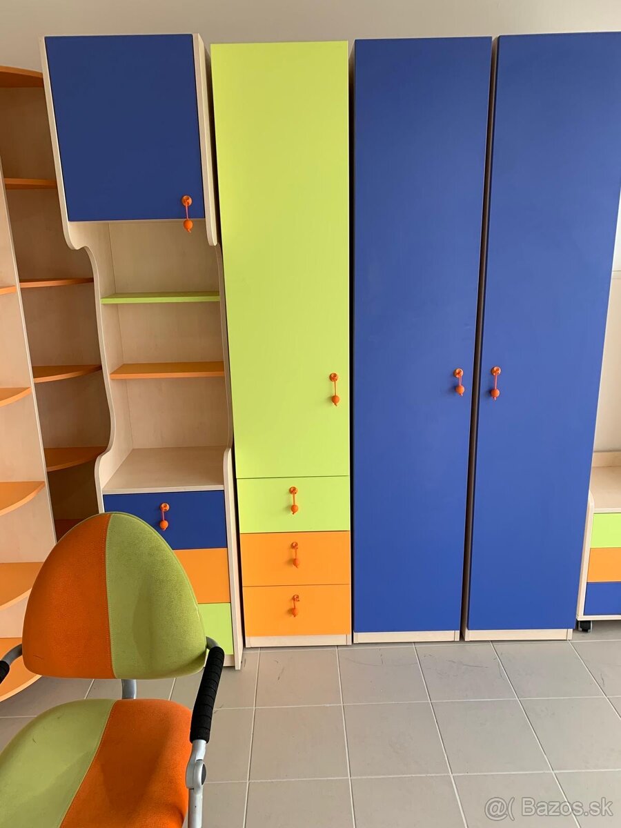 Predam velmi pekný nabytok do detskej izby s poschodovou postelou +pristelka (3 osoby) alebo odkladaci suflik. Schody k posteli su masívne, so šuflíkmi. Zostava obsahuje komody,policky so skrinkami, satnikova skrina, police, pisaci stol,kancelarska stolicka, zrkadlo… Dohoda možná