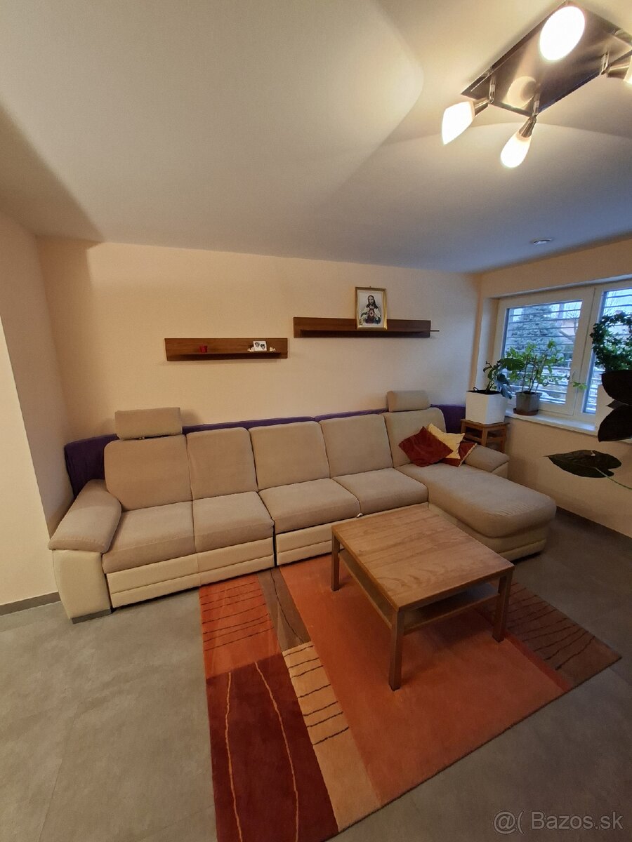 Predám priestrannú sedačku s imitáciou brúsenej kože. Celková dĺžka je 346 cm, dĺžka otomanu 115 cm a výška sedacej časti 45 cm. Sedačka má výsuvnú časť s možnosťou rozloženia na lôžko pre jednu osobu a tiež praktický úložný priestor v podobe zásuvky. Pohodlná a kvalitná, nevysedená, čistá v hosťovskej na prízemí v dome. V prípade rýchleho jednania, možná zľava z ceny. Pozri aj moje ďalšie inzeráty. Predávam aj obývačkovú stenu.