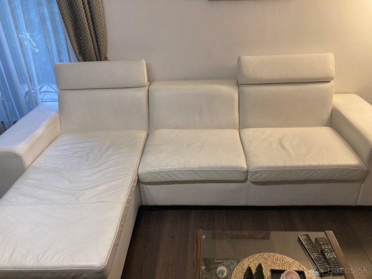 Predám modernú, koženú sedaciu súpravu v bielej farbe s úložným priestorom. Pravá koža. Sú na nej mierne známky používania (viď. foto).