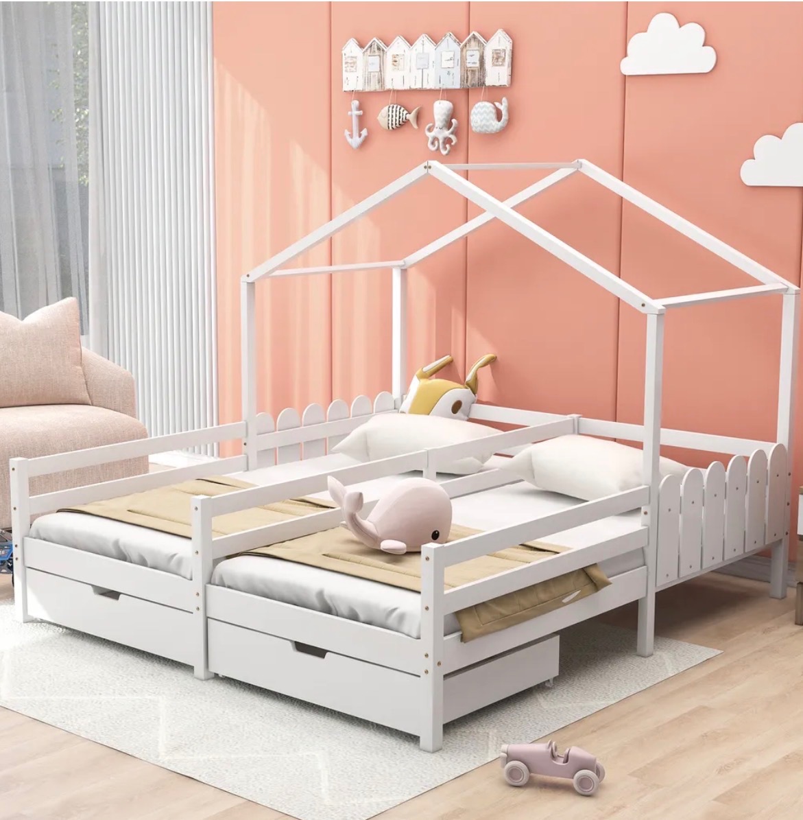 Predám posteľ pre dve deti. Posteľ je zložená v stave viď na foto. Vhodná pre dvojičky alebo dvoch súrodencov. Rozmery celej postele 180x200. Predáva sa aj s rostami, bez matraca