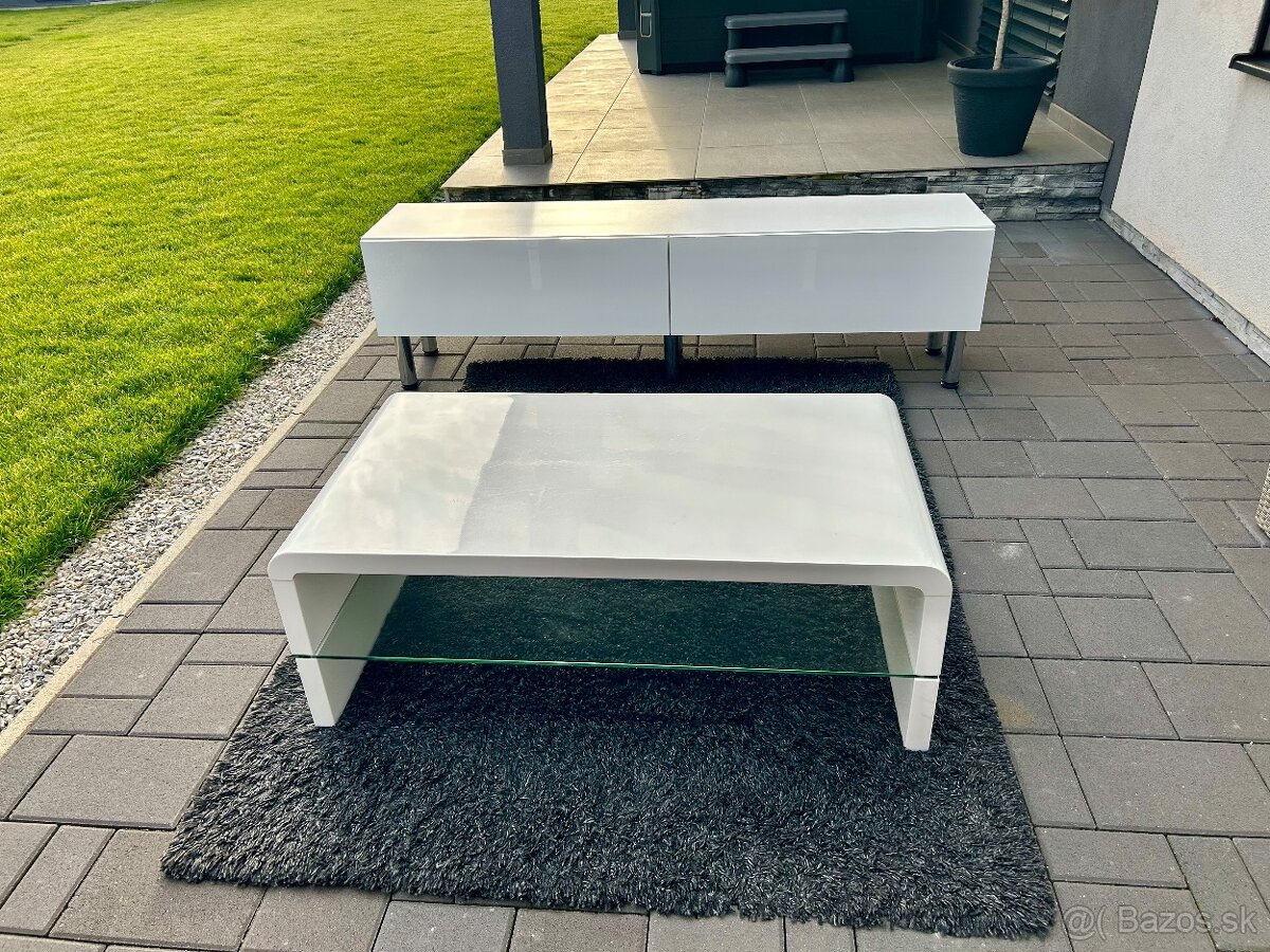 Ponúkam na predaj súpravu do obývačky. Lesklá biela farba, bez poškodenia. TV stolík 180x50x40cm. Koberec antracit, stredne vysoký vlas 135x190cm. Konferenčný stolík 110x40x60cm.