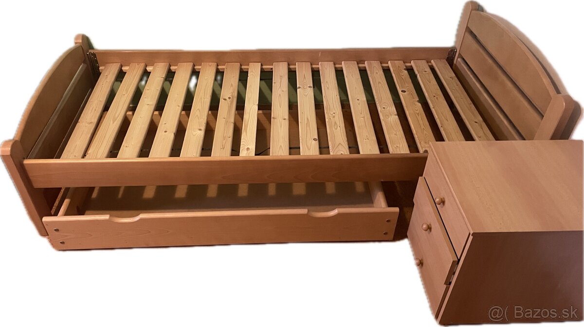 drevená posteľ s dreveným roštom - [10.2. 2026]posteľ z dreva, rošt, úložný priestor - šuflík na kolieskach (všetko masív). Bez matraca.