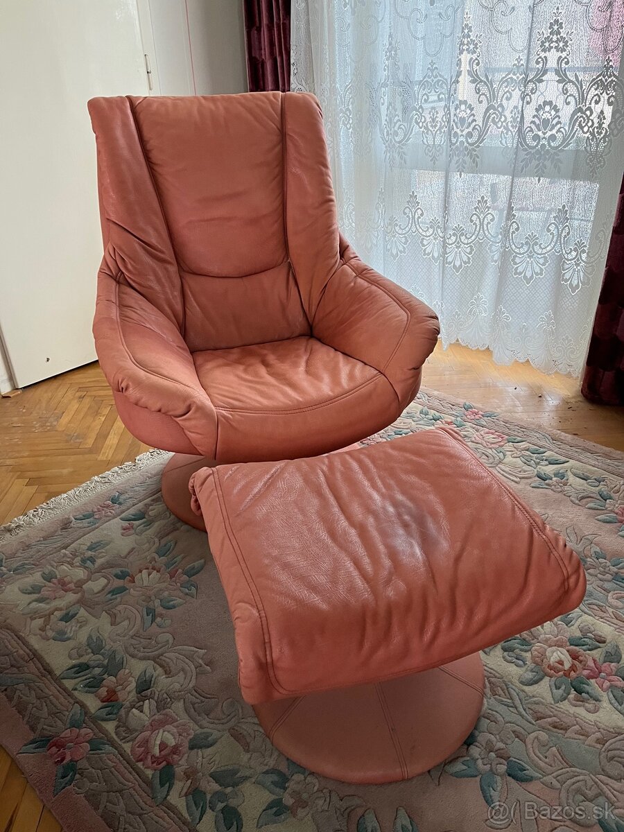 Ponúkam na predaj kožené kreslo v zaujímavej lososovej farbe. Podložka pod nohy je už vyšúchaná ale nie potrhaná. Kreslo tiež nie je nikde potrhané. Celkový stav je veľmi dobrý. Dohoda možná.