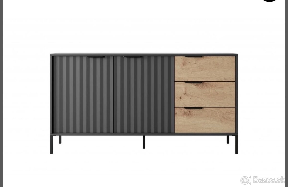 Predám úplne novú, originálne zabalenú komodu v modernom dizajne – kombinácia čiernej farby a dekoru dub riviera. Komoda je nepoužívaná, vhodná do obývačky, spálne alebo kancelárie.