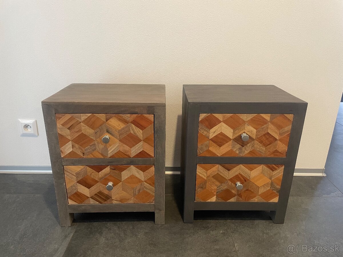Predám 2 ks nočné stolíky, vyrobené z tiku. Rozmery: - v. 50cm, š. 40cm, h. 30cm. Dôvod predaja, zmena dispozície.