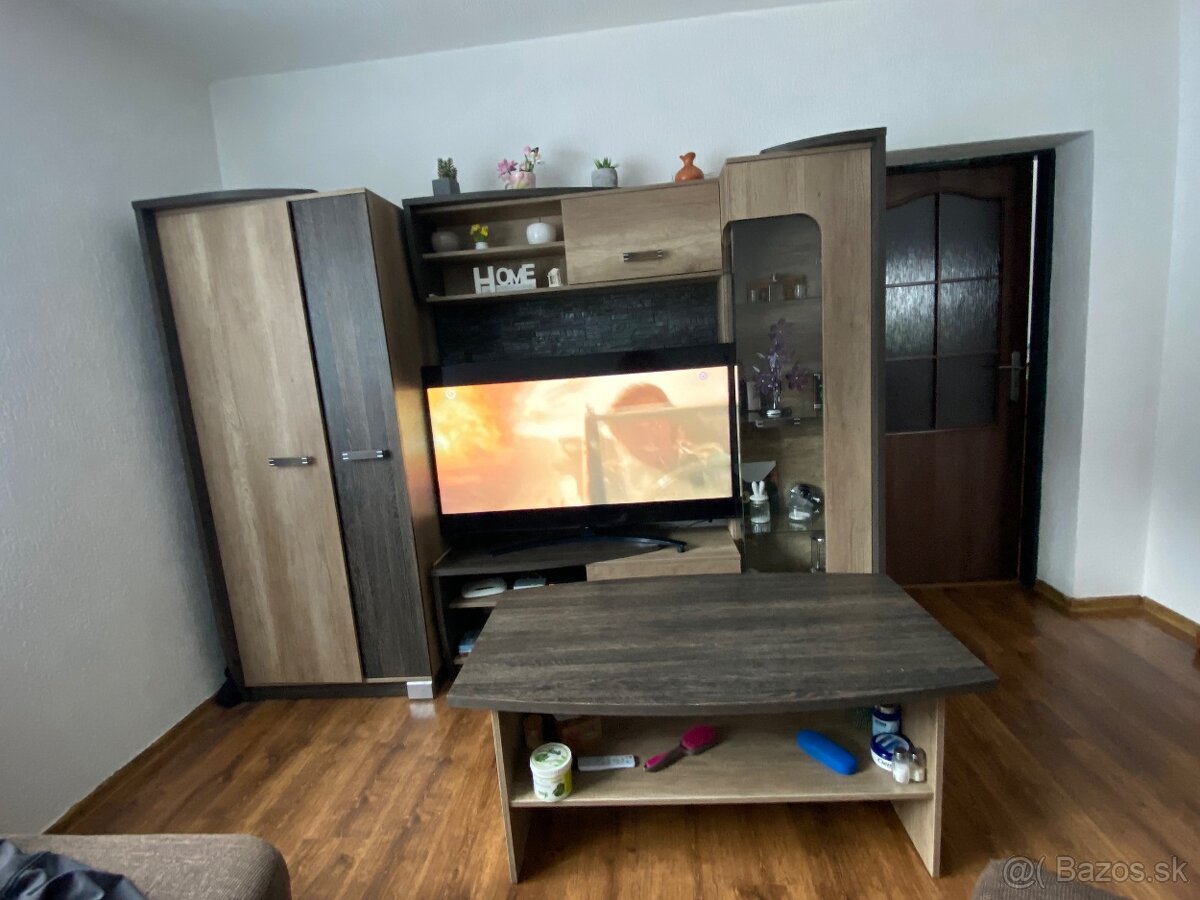 Predám obývaciu stenu so stolom,najlepšie by bolo spolu za 120€ Obývacia stena rozmer: 250cm, nachádzajú sa tak šuflíky, skriňa a presklená skrinka. Stôl aj obývacia stena sú nepoškodené. Predám bez tv a zvyšných doplnkov. Ak by mal niekto záujem zvlášť cena za obývaciu stenu je 100€ a za stôl 30€.