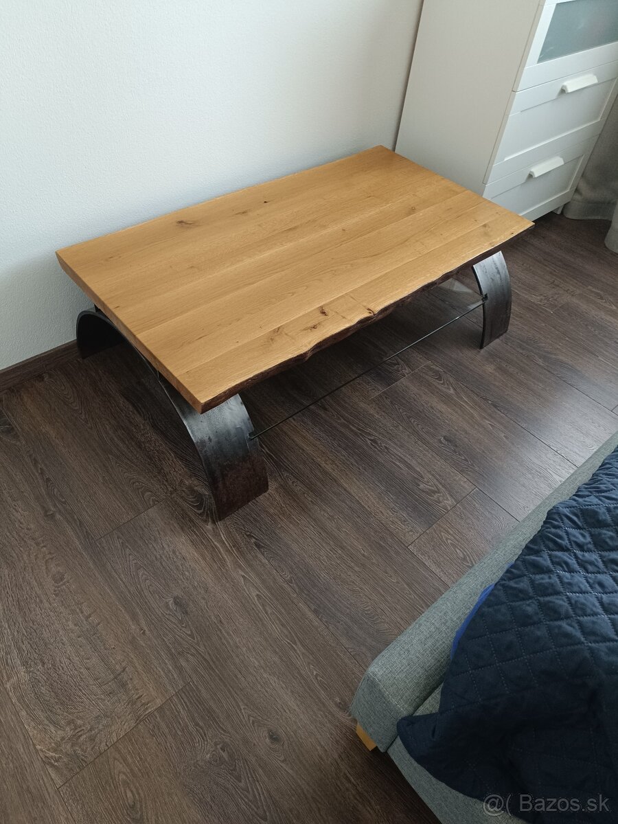 Predám drevený masívny konferenčný stolík. Konštrukcia je z ocele, polica zo skla a vrchná doska je zo 4cm drevená doska z orecha. Rozmery na obrázku.