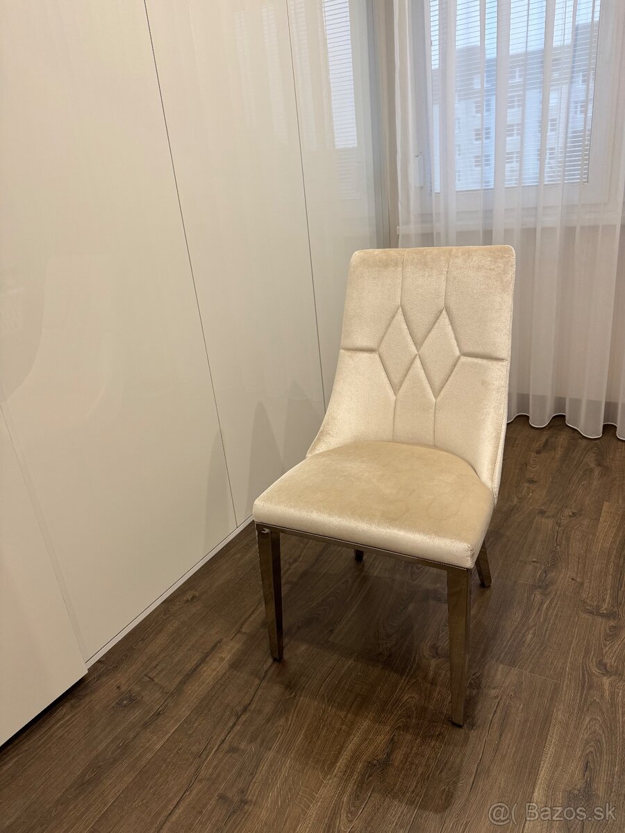 Čalúnené stolicky béžovej farby s perleťovým odleskom. Cena je za všetky stoličky. Rozmery 95cm vyska, opierka 53cm, sedacia časť 45cm