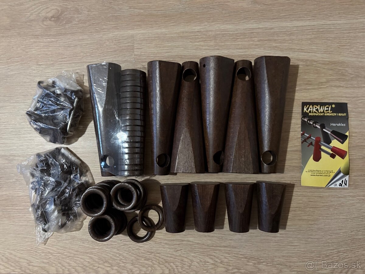 Predám nový nepoužívaný garnižový set - drevený, tmavohnedý. Bez tyče. Iba nadstavce, držiaky, krúžky, šrúbky - viď. foto.