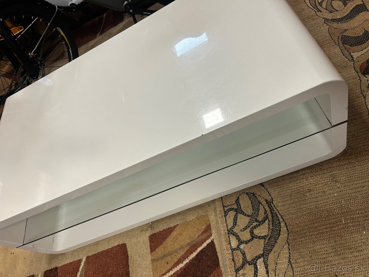 Ponúkam na predaj stolík do obývačky V zachovalom stave vysoko leštený biely spodná polička sklo výška 40 cm šírka 60 cm a dĺžka 120 cm