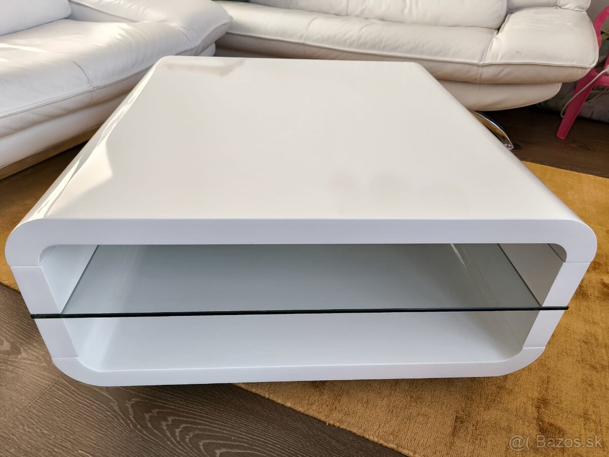 Predam konferenčný stolík na kolieskach, biely vysokolesklý materiál, v strede stolíka polička zo skla o hrúbke 1 cm. Rozmer 80 cm x 80 cm, minimálne používaný, ako nový.
