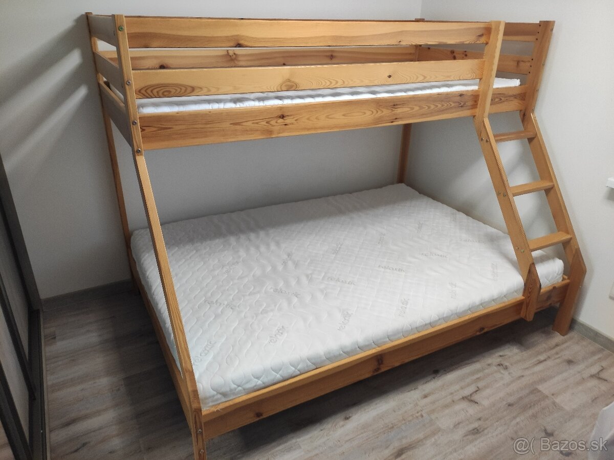 Predám poschodovú posteľ s matracmi. Spodné lôžko 200*140, vrchné 200*90. Vrchný matrac bol kupovaný pred 4 rokmi a spalo sa tam príležitostne. Spodný bol využívaný. Oba bez fľakov. Pridám staršie plachty, prípadne starý chránič na matrac.