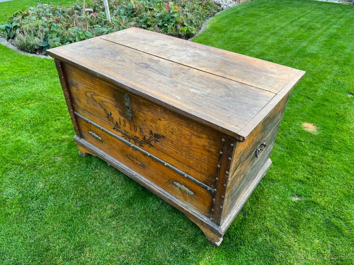 Predám starú drevenú truhlicu. Má rozmery 114 cm x 64 cm x 73 cm. Truhlica je v pôvodnom stave. Šetrné očistenie povrchu truhlice zachováva jej prirodzenú krásu. Stav viď. fotky.