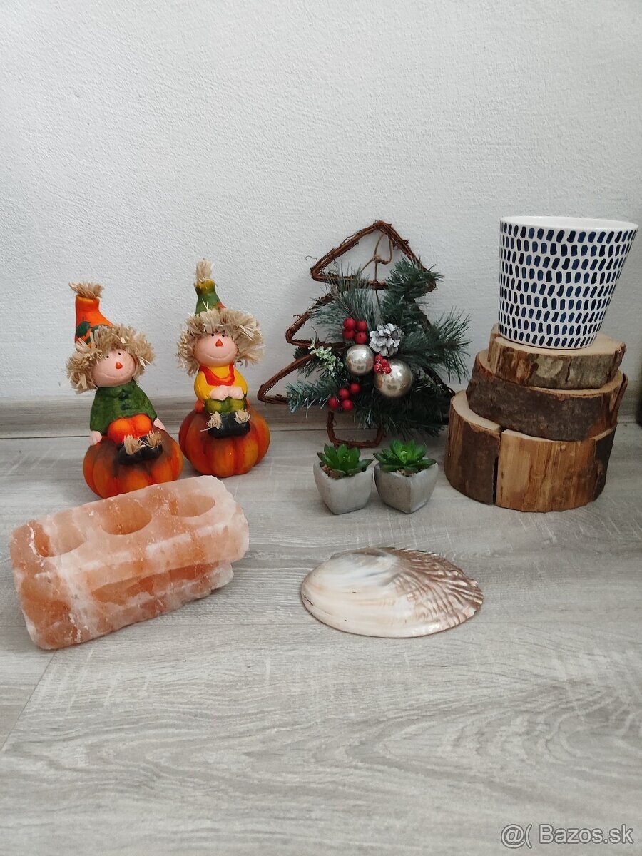 drevené kolieska 3€/ks, srdiečko 8€,kvetináče 2,50€/ks, kvetináč ježko 3€, svietnik čierny 10€, korýtko 2€, zasnežená gulička s ježkom 1€, zelená guľka 1€, kvety v betónovom kvetináčiku 1,50€/ks, vrecko červené 2€