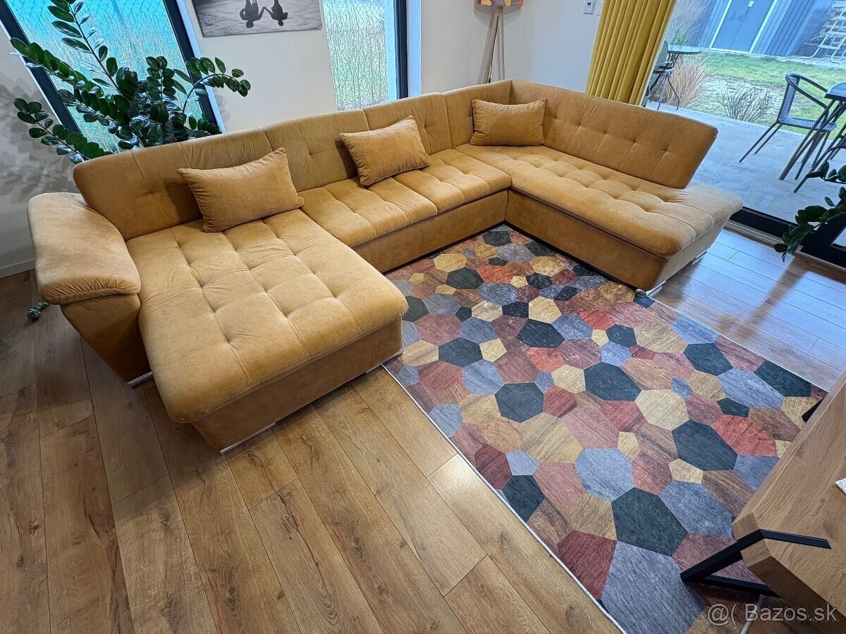 Predám sedaciu súpravu v tvare U. Sedacia súprava je rozkladacia bez možnosti úložného priestoru. Materiál: semiš. Farba: horčicová.