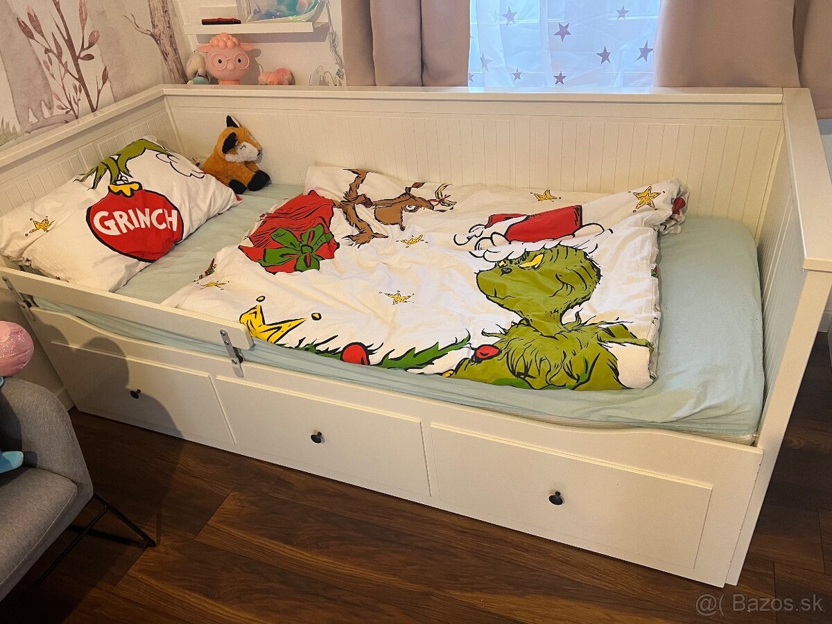 Predam postel vo velmi dobrom stave - obcasne znamky pouzivania, par deobnych tukancov, nic rusive. Technicky v super stave. Rozkladatelna s uloznym priestorom. K pridavnemu lozku je kvalitny Ikea matrac, ktory sa predava ako hlavny na tuto postel. Hlavny matrac je stredne tvrdy s aloe vera, kvalitny, povodna cena 200€. Matrace su vyskovo vyvazene, aby po rozlozeni tvorili plnohodnotne dvojlozko bez vyskovych rozdielov.