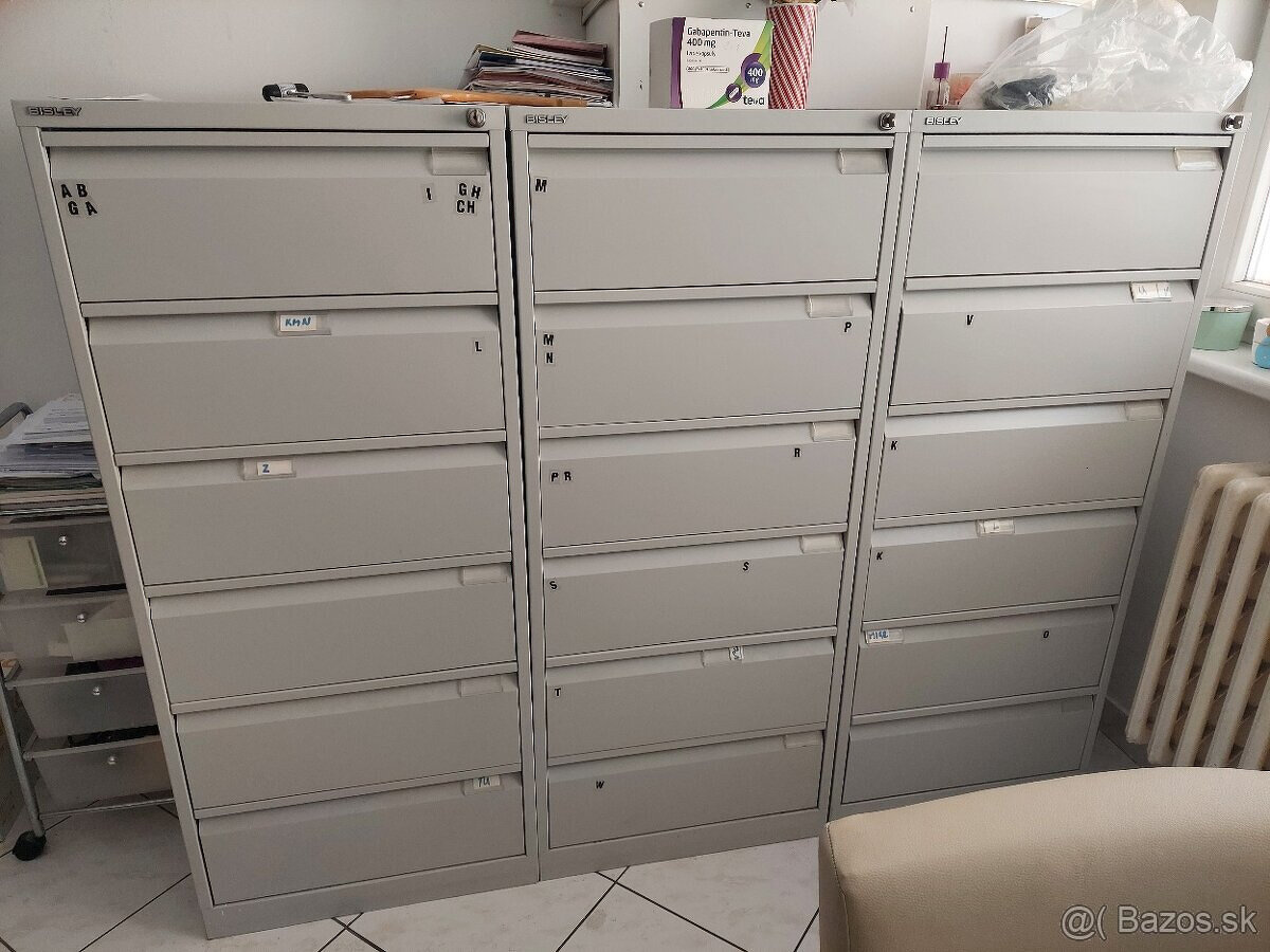 Kartoteka , kartotéčne skrine pre lekára do ambulancie alebo na kartoteku A5 pre kohokolvek znacky Bisley 4 kusy, trojradove velke 4 sufliky, cca 5 rokov kúpené, 3 sede a jedna biela cena nových cca 700 eur kus , naša cena 300 kus, spolu 1200 eur za vsetky plus vlastny odvoz. kovove kartoteky