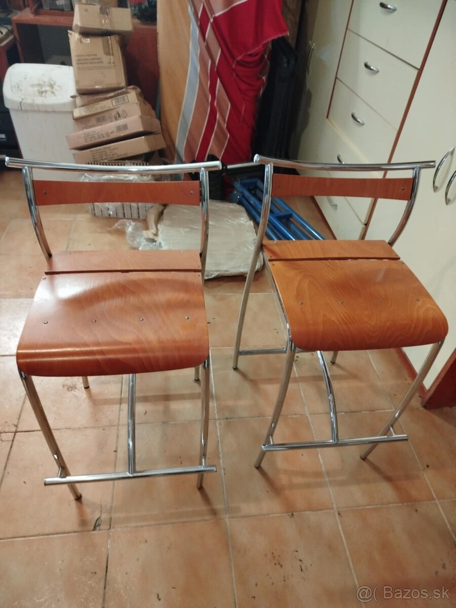 Predám barové stoličky 2 ks, cena za 1 ks je 20,- €. Užívané, pevné, nepoškodené. Farba dreva - čerešňa.