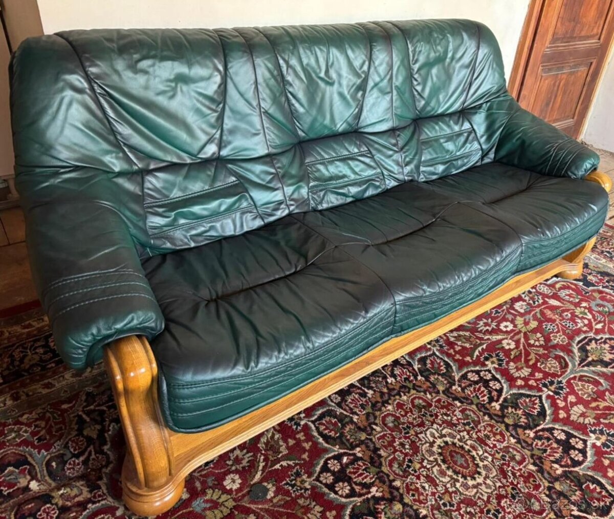 Nabízím k prodeji rustikální koženou sedačku - trojsedák v tmavě zelené barvě.