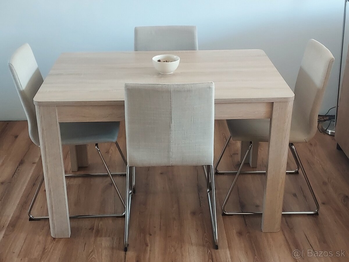 Predám kuchynský stôl: 80x120 cm, 4 x stoličky a konferenčný stolík: 80x80 cm. Farebné prevedenie: dub bardolino.