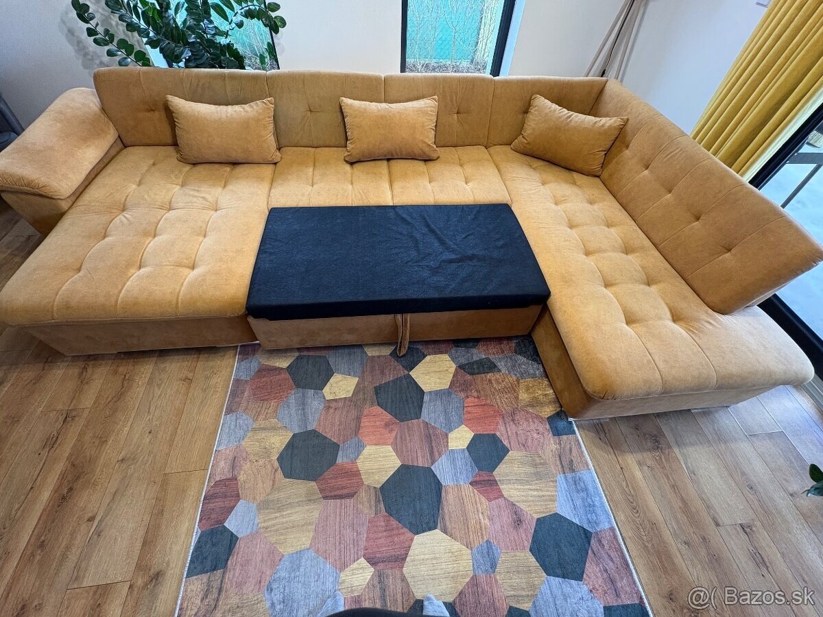 Predám sedaciu súpravu v tvare U. Sedacia súprava je rozkladacia bez možnosti úložného priestoru. Materiál: semiš. Farba: horčicová.