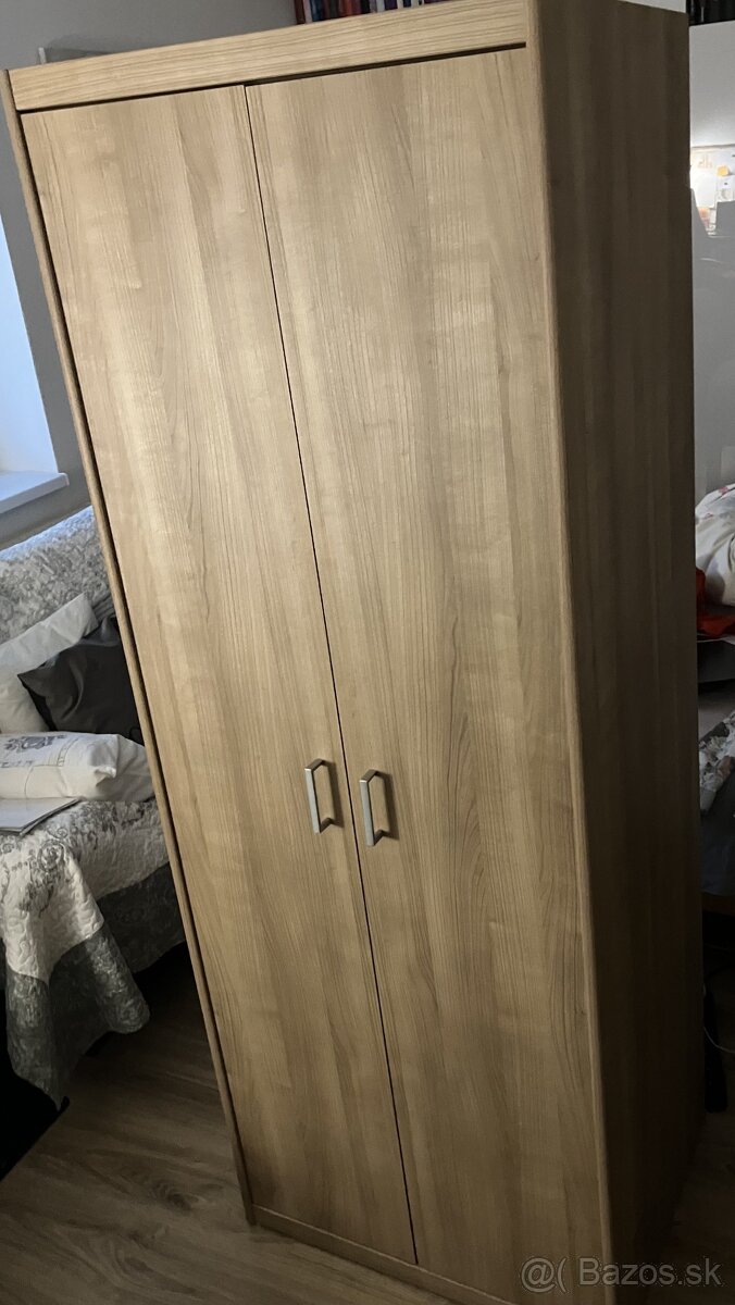 Predám šatníkovú skriňu v dekore svetlé drevo. Skriňa je pevná,stabilná,dvierka aj pánty sú v poriadku.Rozmery:výška 194 cm, šírka 72 cm a hĺbka 54 cm. Len osobný odber.