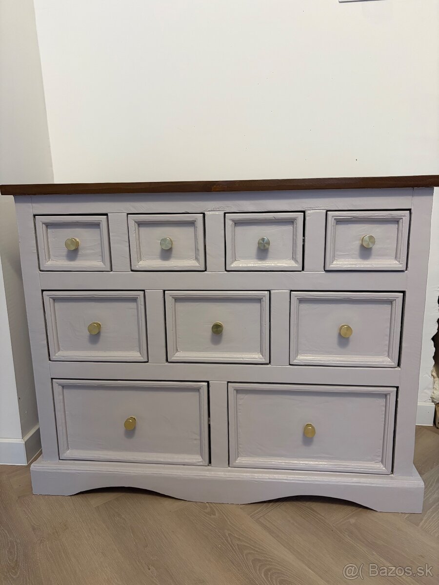 Predám zrenovovanú komodu z mäkkého dreva s riflovanymi zlatými úchytkami .