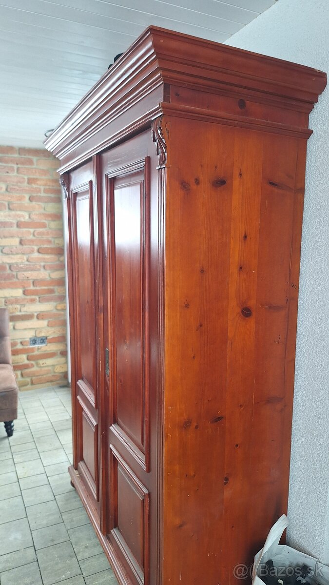 Predám túto starožitnú skriňu v čerešňovej farbe. Bez červotoča,pekný lesklý povrch,sem-tam škrabanec. Jedna polovica je policová, druhá vešiaková. S rímsou a vyrezávanélými detailami.