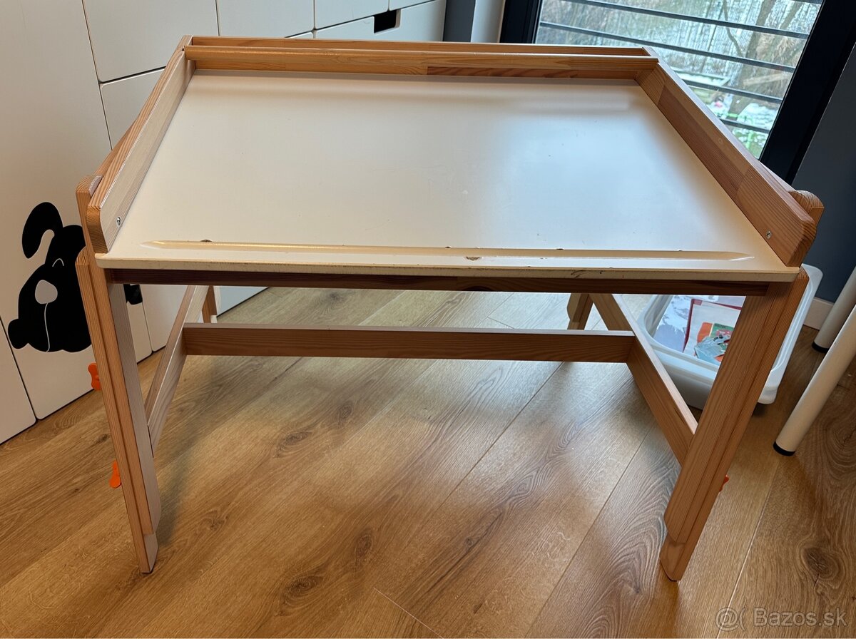 Detsky stol, nastavitelna vyska - 3 moznosti, nastavitelny sklon pracovnej dosky. Drziak na papierovu rolku. Drobne skrabance (foto), chyba jedna skrutka (rovnaka funkcnost). Moznost rozlozit. Iba osobny odber.