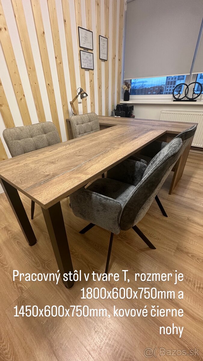 Predám nový nábytok do kancelárie vyrobený z materiálu dub Halifax cínový a béžová. Stôl je v tvare T, otvorená skrinka, polička a úzka dverová komoda. Rozmery sú uvedené pri jednotlivých kusoch nábytku.
