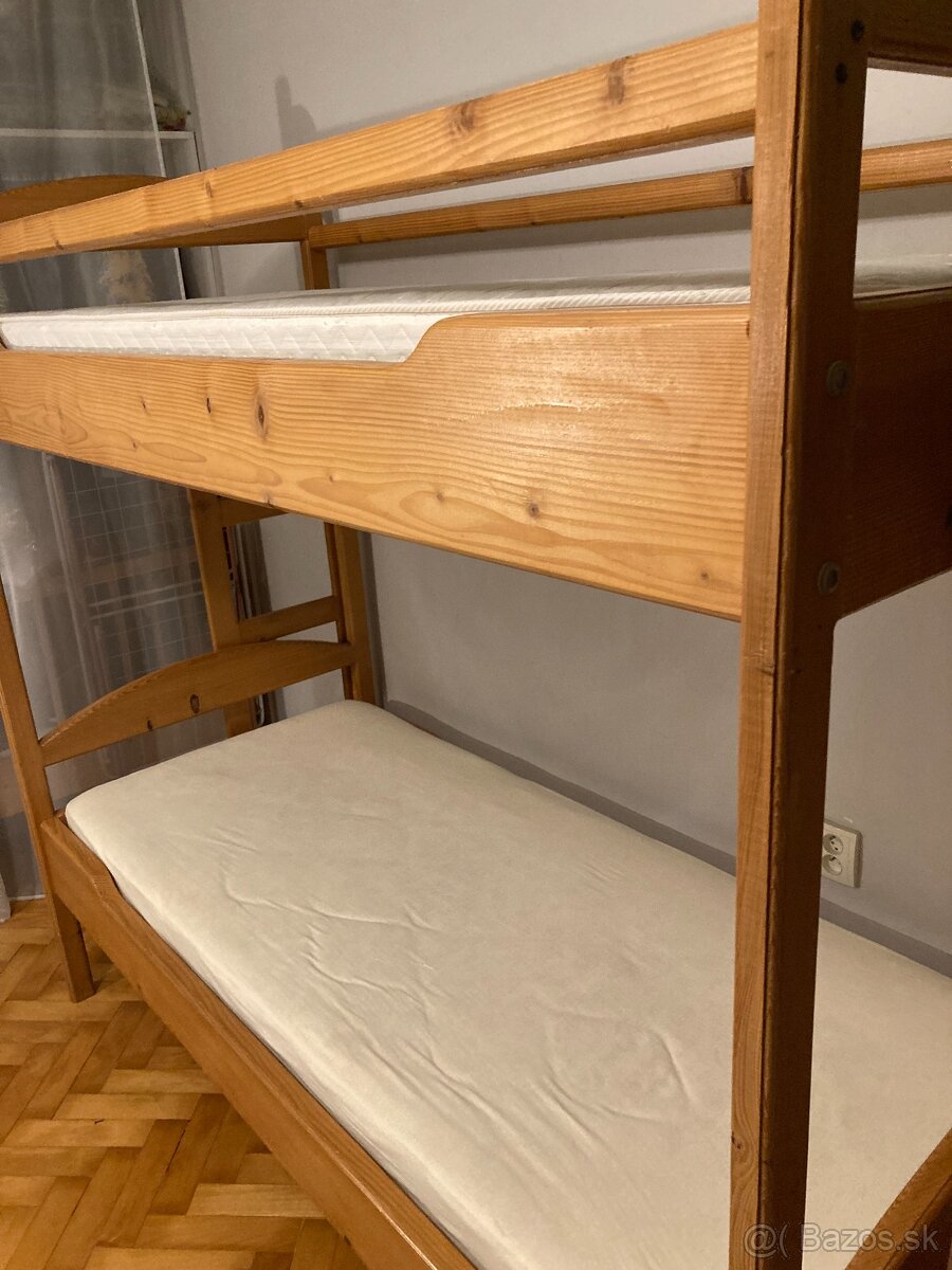 Poschodová posteľ - [22.2. 2026]Predám detskú drevenú poschodovú posteľ zo smrekového dreva vo farbe dub. Posteľ je používaná a predáva sa s matracmi 180 x 85 a laťkovými roštami. Skladá sa zo spodnej, vrchnej postele a z prístelku. Odkladacie šuflíky nie sú súčasťou. Nachádza sa v rozmontovanom stave, okrem prístelku. Posteľ je m ...