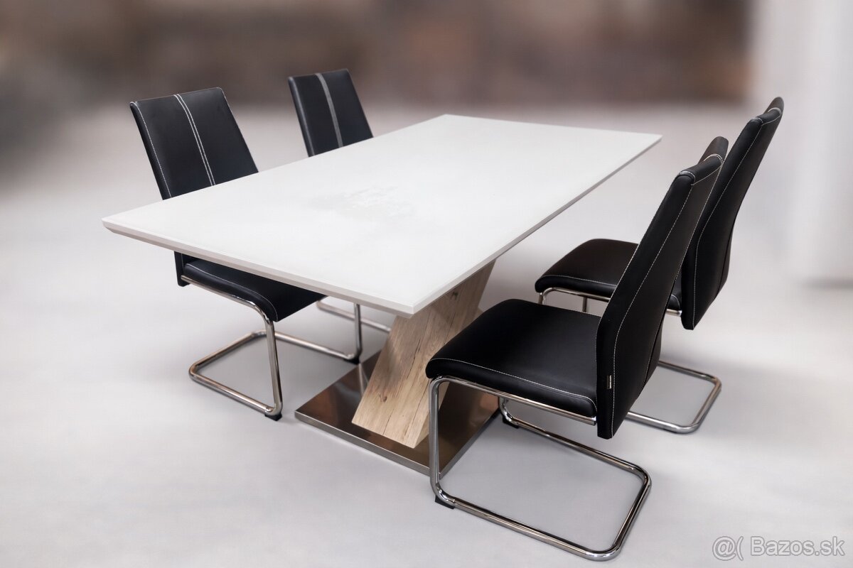 Stôl je stabilný, mohutný z dreva s laminovaným sklom na vrchu. Stoličky z eko-kože majú iba minimálne známky používania.