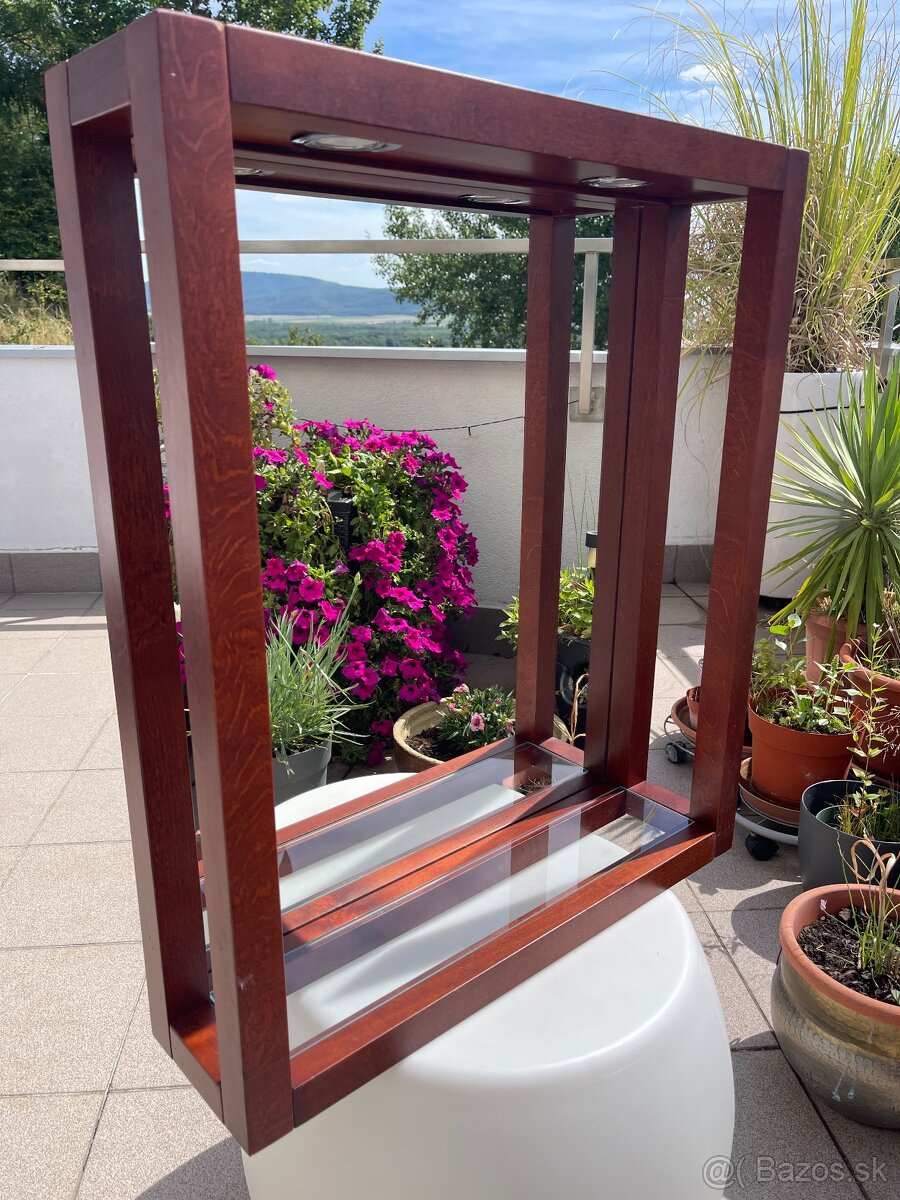 Zdrkadlo s dreveným rámom, dve svietidlá na vrchu, na spodnej časti sklenená polička