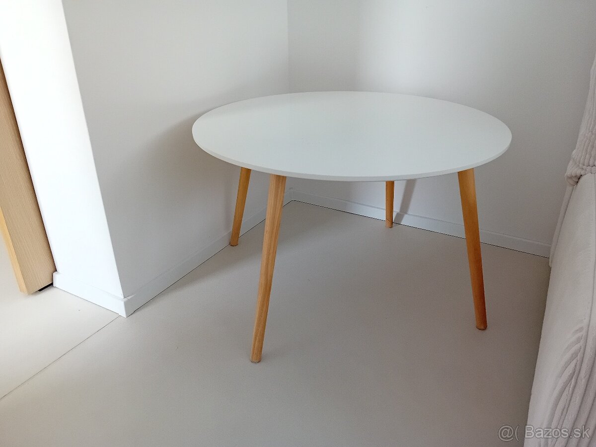Predám konferenčný stolík o priemere 75 cm v bielej farbe s drevenými nožičkami.