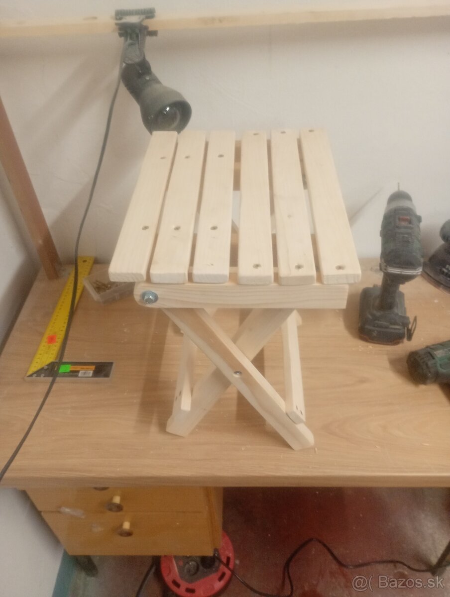 Zdravím ponúkam na predaj ručne vyrábané skladacie stoličky vhodné na balkón záhradu oddych v prírode,stanovanie, kemping, rybačku a podobne. Rozmery stoličky su D-32cm V-37cm a Š-24,5cm po zložení je šírka stoličky 6,5cm Po dohode je možnosť spraviť aj viac kusov plus skladací stolik