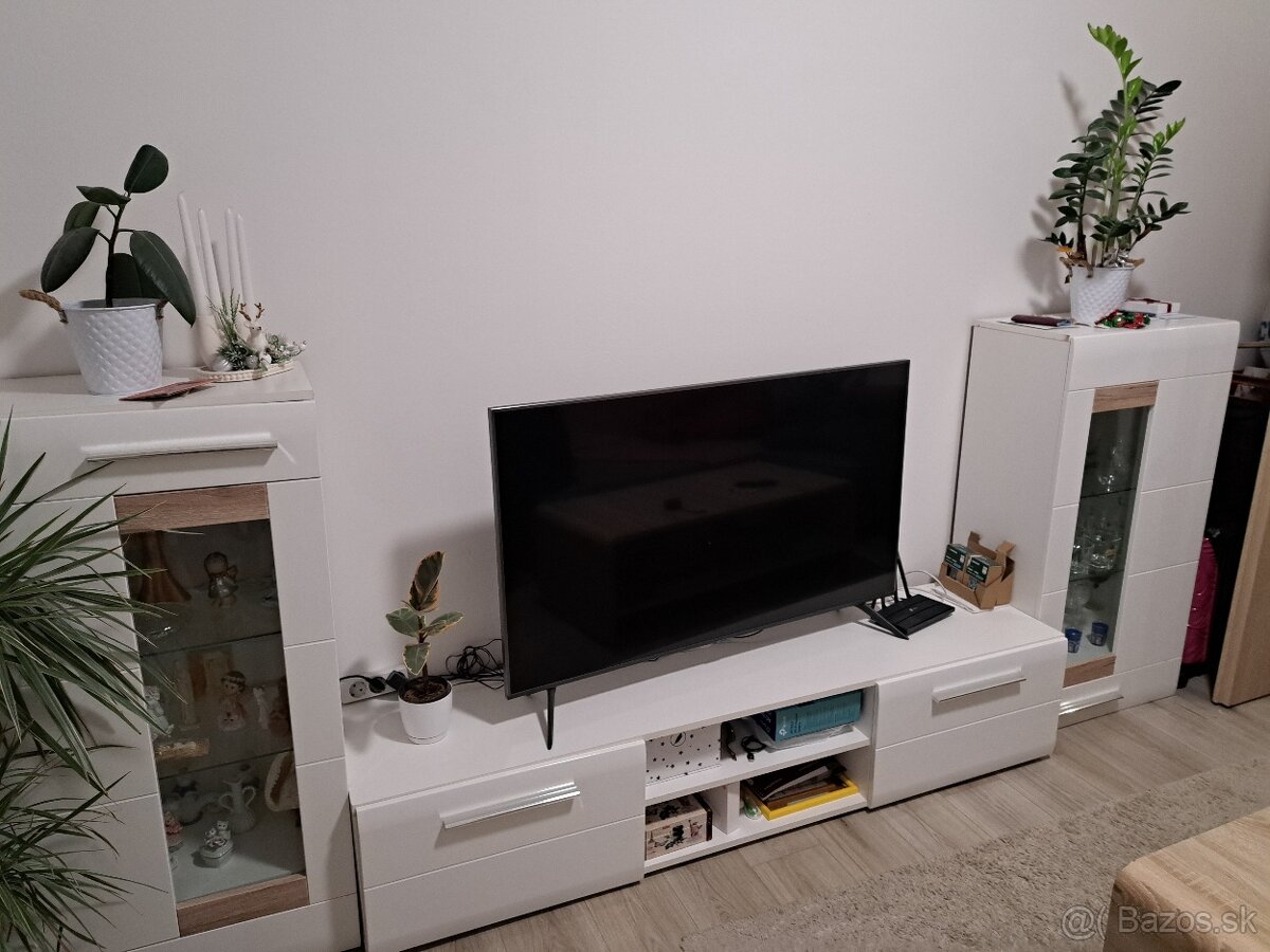 Biela obývacia stena - [1.2. 2026]Predám modernú obývaciu stenu v bielej farbe. Stenu tvoria tri skrinky a jedna polica. Dve skrinky majú sklenené vitríny, ktoré aj svietia. Stena je dlhá 2,80m a vysoká 2m. Pod policou je priestor na televízor. Spodná a ľavá bočná skrinka má dostatok políc na úložný priestor.