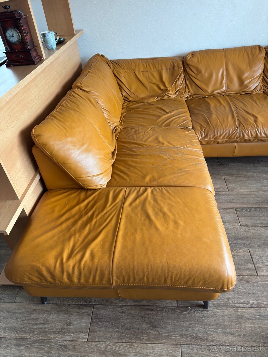 Rozmery: 2,7m x 2,2 m, rozkladací, s úložným priestorom, koža pampas, karamelovej farby. Stav: mierne opotrebovaný. Pôvodná cena: 1699 eur. Osobný odber.