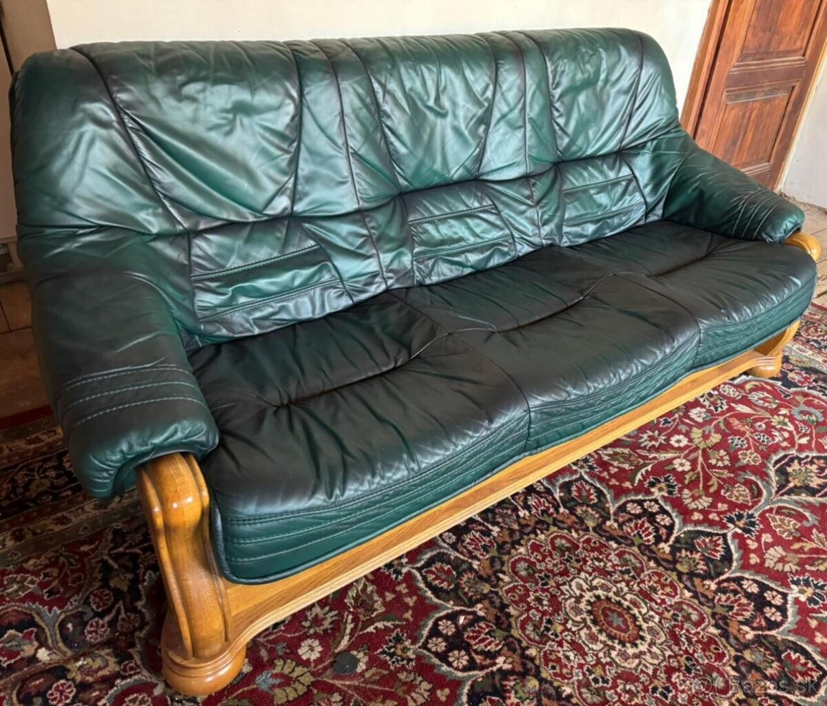 Nabízím k prodeji rustikální koženou sedačku - trojsedák v tmavě zelené barvě.