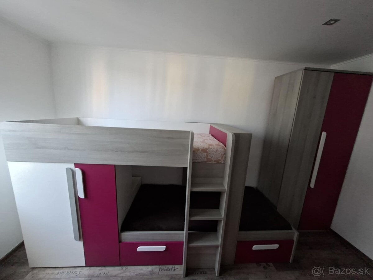 Z dôvodu sťahovania predám túto detskú posteľ bez matracov . So skriňou zabudovanou v posteli a druhá skriňa vedľa posteli. Potrebný vlastný odvoz a rozmontovanie posteli v prípade potreby . Cena je pevná !