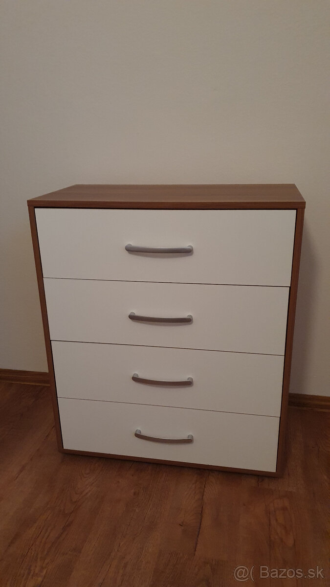 Predám komodu v dekore biela/orech, ako nová, kupovaná cca pred dvomi rokmi za 130€, rozmery š 70 × h 35 × v 82 cm