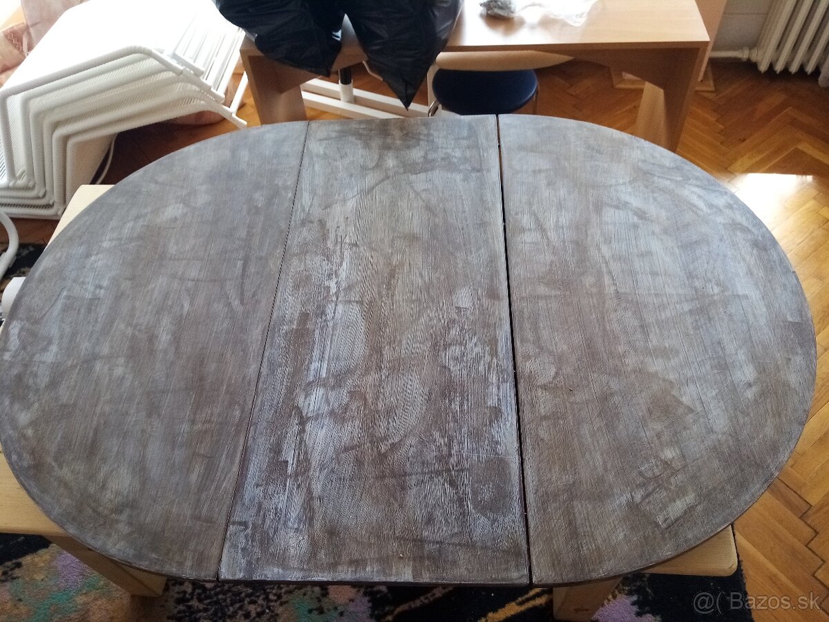 Predam stol + 4x stolicky , vhodne na chalupu , stol je rozkladaci , krasny, pevny, drevenny roztahovaci -okruhly o priemere95cm + medzikus 40cm , spolu ako oval s.135 cm s vyskou 76cm.