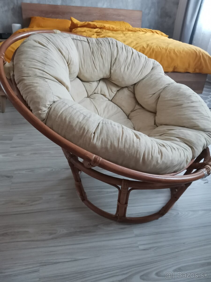 Veľké okrúhle prútené kreslo. Skladá sa z podstavca, sedenia a matraca. Priemer cca 100 cm. Má poškodenie, tie spoje (povraz) sa rozmotali na niektorých miestach. Je to zalepené páskou, viď foto. Cena 20€. Osobný odber Spišská Belá.